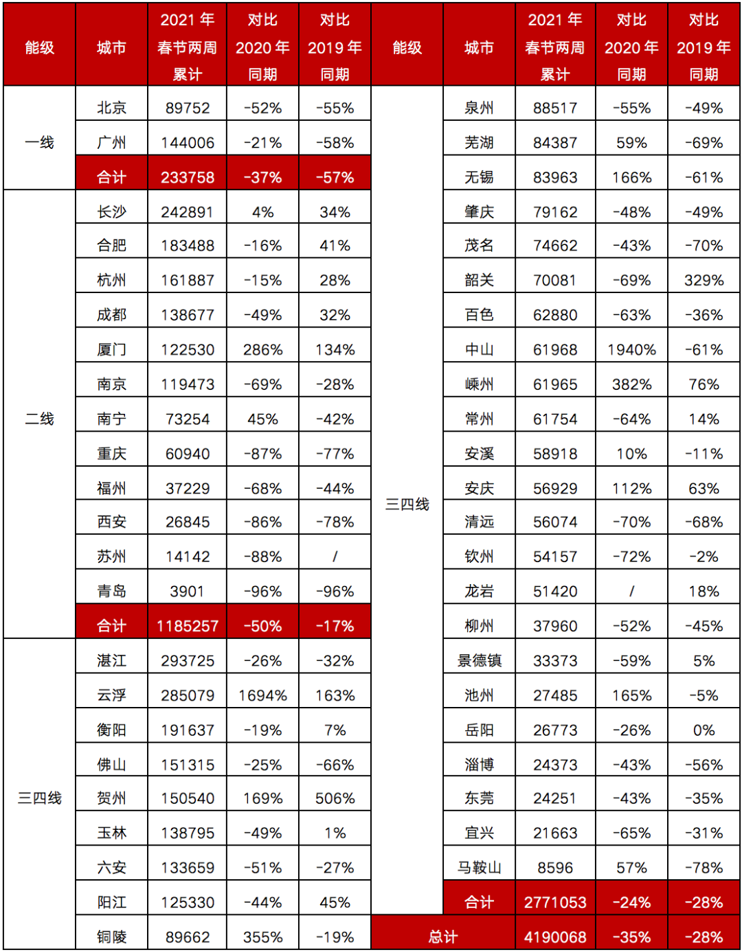 一線城市在春節期間表現可圈可點,2021年春節兩周成交量增幅較2020年和2019年同期均大幅上漲50%以上。