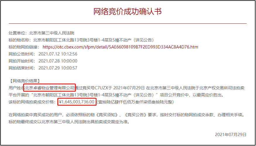 據(jù)北京交易產(chǎn)權(quán)網(wǎng)顯示,北京市朝陽區(qū)工體北路13號院3號樓1-4層及5幢不動產(chǎn)于2021年07月28日10時開始網(wǎng)拍,在經(jīng)歷24小時后,于2021年07月29日10時左右被北京卓睿物業(yè)管理有限公司以16.45億元的價格成功拍下。