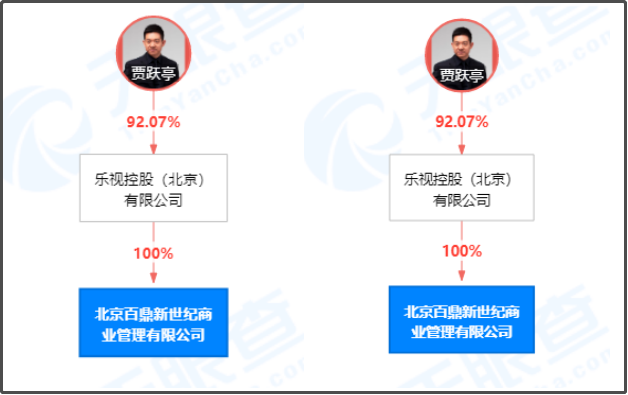 據(jù)天眼查顯示,北京財富時代置業(yè)有限公司注冊資本10.1億人民幣,由樂視控股(北京)有限公司100%控股,法定代表人為吳孟;北京百鼎新世紀商業(yè)管理有限公司注冊資本3000萬人民幣,由樂視控股(北京)有限公司100%控股,法定代表人為吳孟。賈躍亭持有樂視控股(北京)有限公司92.07%的股權(quán),賈躍亭為兩家公司的最終受益人。