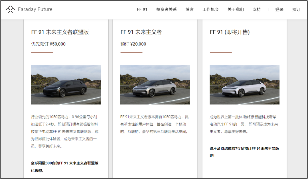 7月28日,賈躍亭在微博中表示,“洛杉磯7月24日早6:30,面向全球極少數(shù)塔尖用戶開放的300臺邀約制限量版FF 91 Futurist Alliance Edition售罄”。