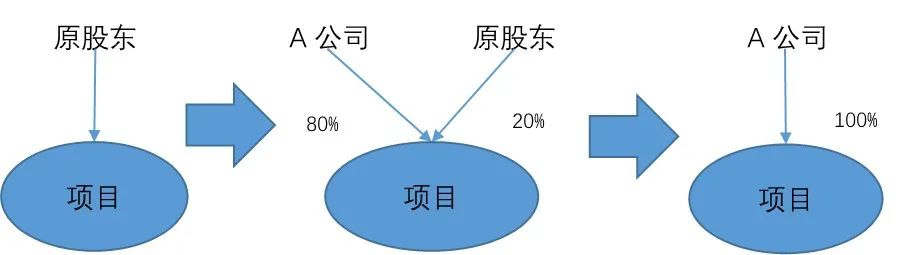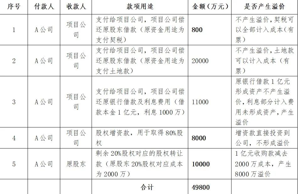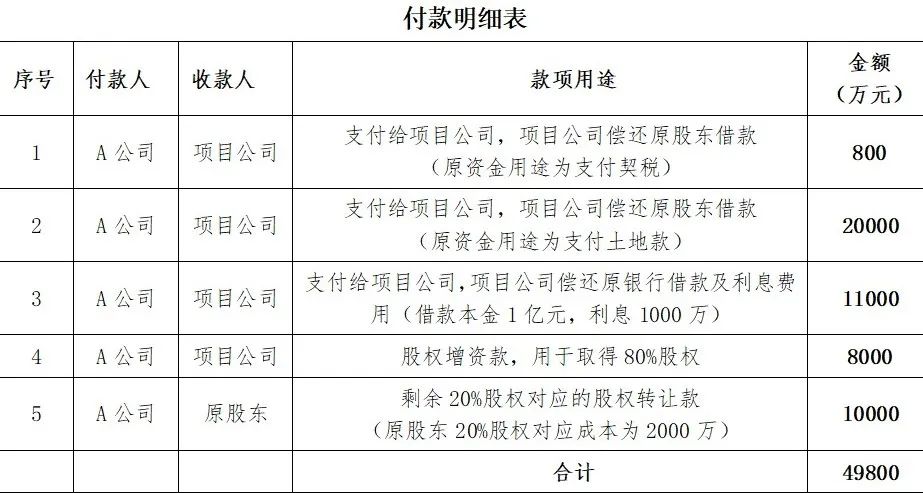 A公司先增資8000萬元進入某項目公司,取得該公司80%股權,后續又通過股轉方式取得剩余20%股權,股權轉讓價格10000萬元。具體支付款項見下述明細表:
