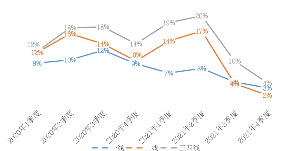 圖:2020年-2021年一、二和三四線土地成交溢價率季度趨勢(單位:%)
