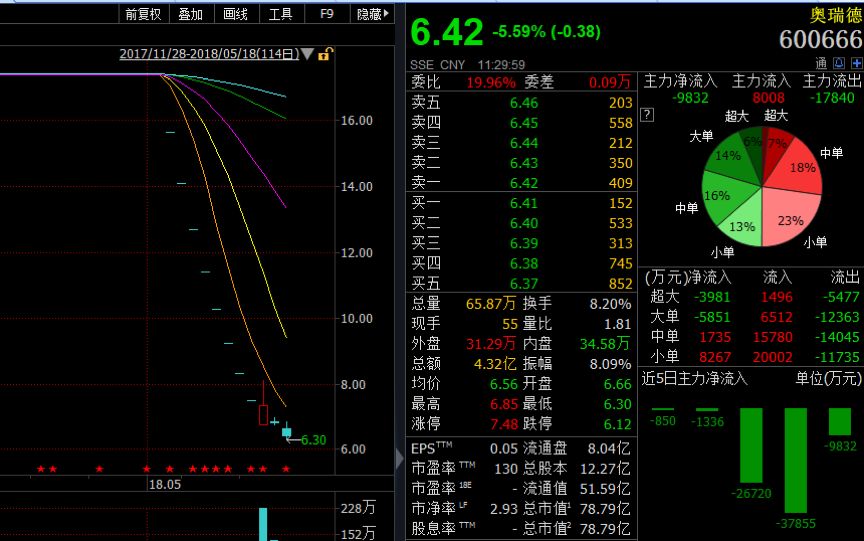 根據奧瑞德2018年一季報:截止2018年3月底,華泰證券為其第二大流通股東,持有3006.31萬股股份,占公司總股本的2.45%。如果沒有及時拋掉股票,8個跌停后,華泰證券總持股市值腰斬,蒸發超過2億元。