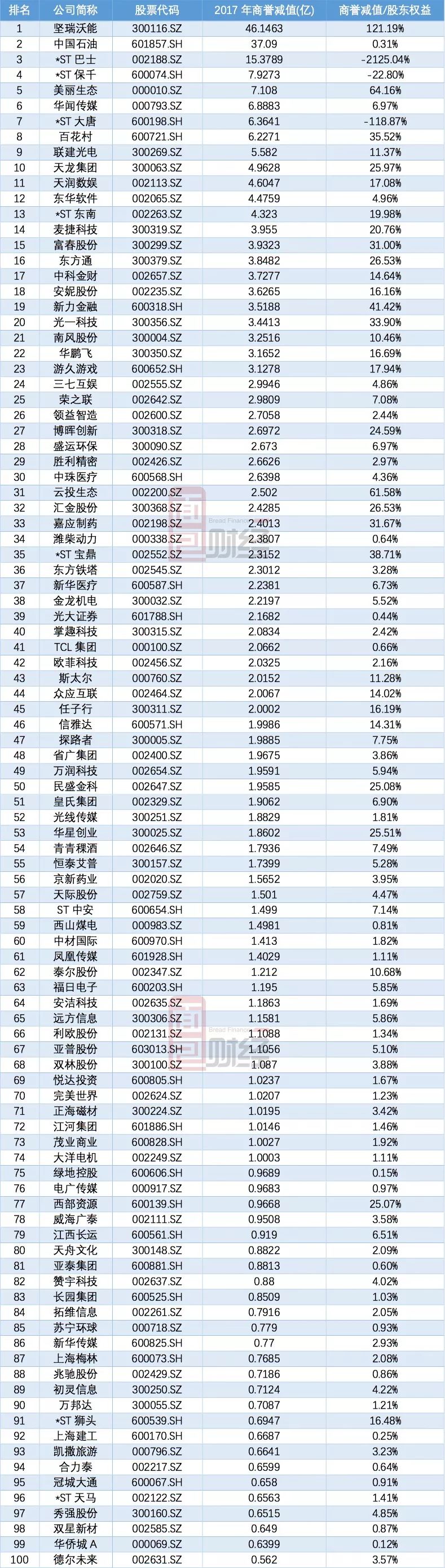 其中,有176家公司2016和2017年連續兩年出現商譽減值。兩年合計減值金額排名前100的公司如下: