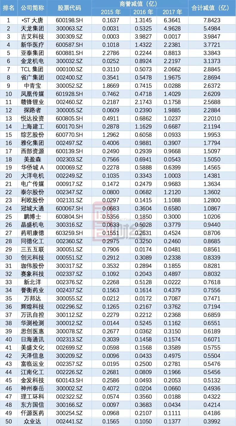 在這里面,還有75家公司2015—2017年連續三年出現商譽減值,累計金額排名前50的上市公司如下: