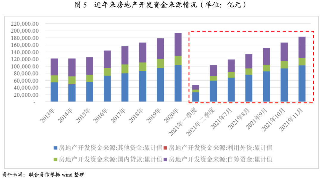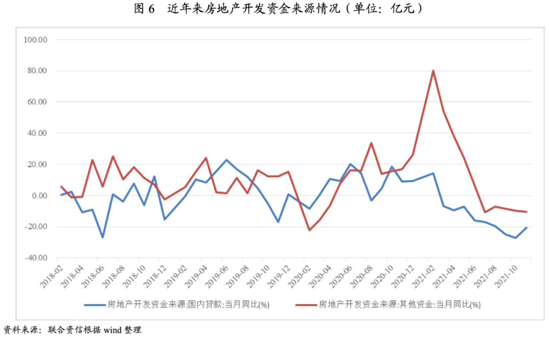 2021年,伴隨著防風險和調結構的貨幣政策基調,房地產行業融資明顯收緊。2021年1-11月,房地產開發企業到位資金合計18.34萬億元,同比增長7.17%;從單月看,7月開始,到位資金同比增幅開始轉負,7-11月當月降幅分別為-6.99%、-6.52%、-11.21%、-9.48%和-7.01%。9月底以來,金融管理部門及時對部分金融機構過度收縮行為進行適當矯正,信貸環境邊際改善,房企融資壓力略有緩解。分類別看,其他資金(定金及預收款以及個人按揭貸款)和國內貸款仍為房企到位資金的主要來源,下半年當月到位資金的同比下降主要為其他資金和國內貸款資金共同下降影響。