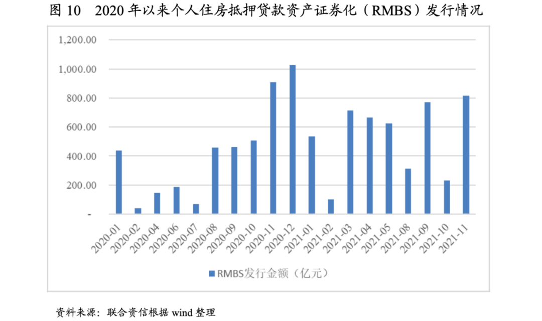 目前,結構化產品融資已經成為房企融資的重要方式,以個人住房抵押貸款資產證券化(RMBS)為例。2021年1-11月,國內RMBS產品發行規模同比增長48.41%,但每月發行量波動較大(6、7月零發行),結構化產品融資受政策影響仍較大。