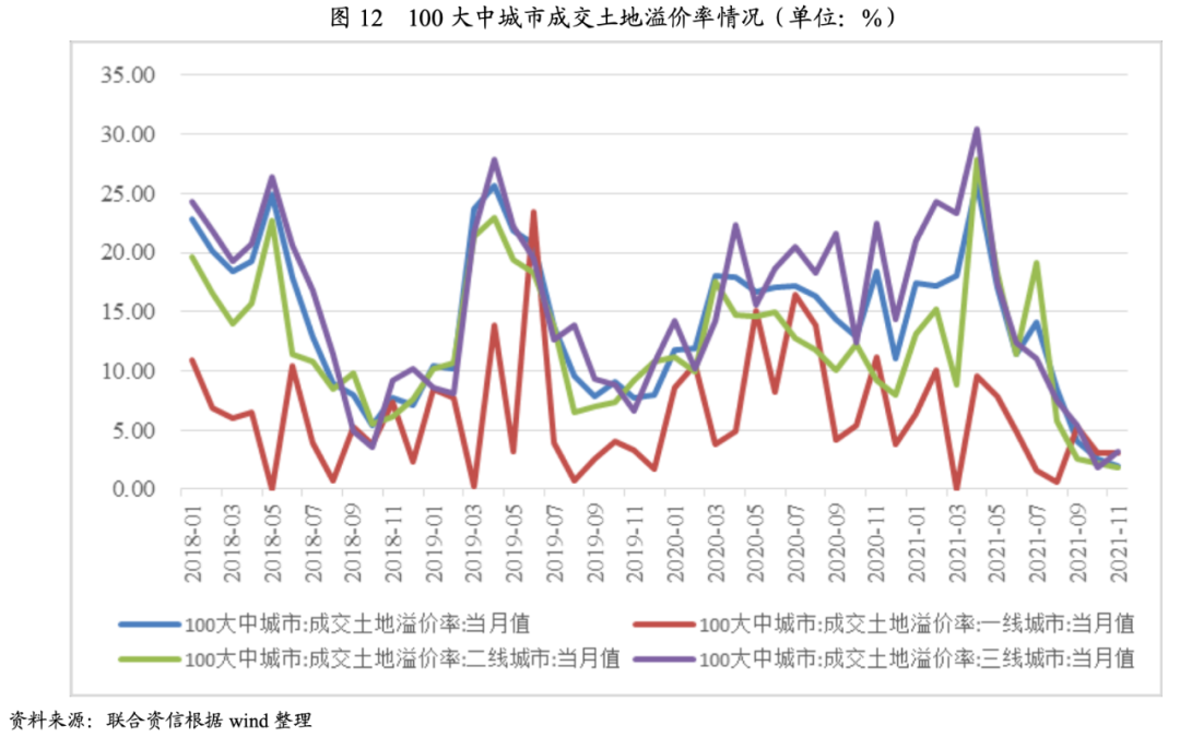 從土地成交溢價率看,一、二、三線城市的土地成交溢價率分化明顯。2021年以來,一線城市土地溢價率整體呈低位波動態勢,振幅較小,開發商對一線城市的未來預期值仍較高。但隨著下半年政策趨嚴及市場遇冷,房企拿地意愿較差,二、三線城市土地溢價率急速下降,截至2021年11月底,二線城市溢價率已由年內新高的27.86%下降至1.83%,三線城市溢價率已由年內新高的30.41%下降至3.19%。