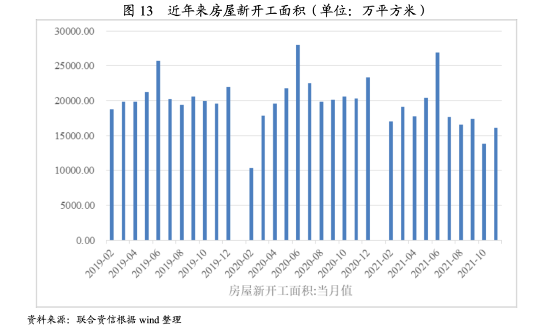 房企拿地成交量下降,行業新開工項目規模也同步下行。2021年1-11月,房企新開工面積規模為18.28億平方米,同比大幅下降9.08%,相較于2019年同期下降10.90%。分月份看,相較于2020年,除2-3月份受疫情因素影響,2021年其余月份新開工面積同比均有不同幅度下降,尤其是7-11月,降幅很大。