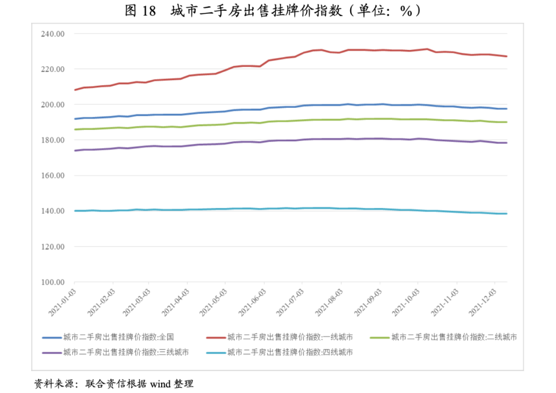 從70大中城市新建商品住宅價格指數看,進入2021年,上下半年價格變動呈現明顯的分化特征:上半年,一、二、三線城市住宅價格指數環比均保持正增長,且增幅持續增加;下半年住宅價格環比急轉急下,隨著購房者房價上漲預期的降低,各線城市價格自9月份開始回落,其中一線城市相對保持穩定,二、三線城市有繼續下探趨勢。從二手房出售掛牌價格看,8月后各線城市價格均呈現波動后下降態勢,但目前看降幅較小。