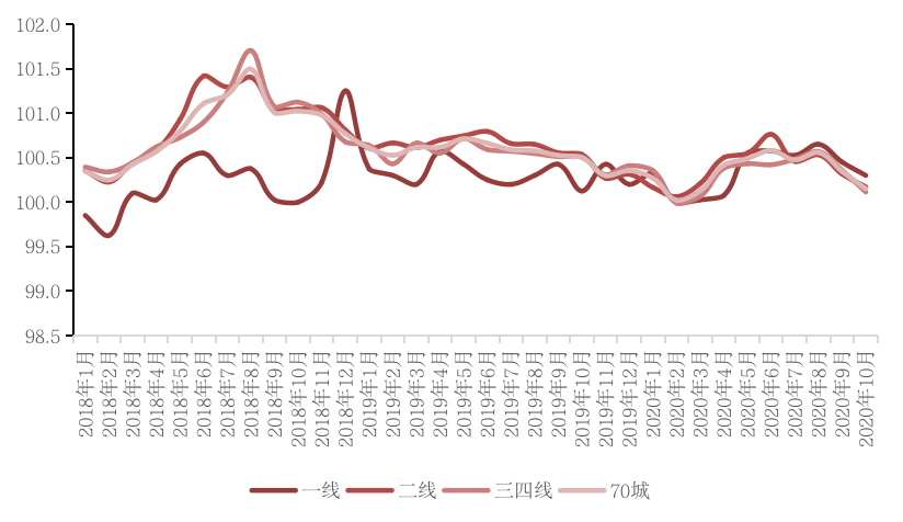 從全國70個大中城市商品住宅銷售價格來看,10月除一線城市同比漲幅繼續擴大外,其余二三線城市新房及二手房房價均同、環比漲幅收窄。具體來看,10月份,4個一線城市新建商品住宅銷售價格環比上漲0.3%,漲幅比上月回落0.1個百分點。其中,北京、上海、廣州和深圳分別上漲0.2%、0.3%、0.5%和0.2%。