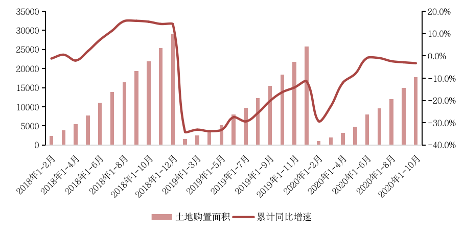 據國家統計局數據顯示:前10月,房地產開發企業土地購置面積17775萬平方米,同比下降3.3%,降幅比前9月份擴大0.4個百分點,連續4個月降幅擴大。受資金面監管收緊影響,房企對于土地購置更加審慎,土地購置面積規模逐月降低,但房企對核心熱點地塊依舊迫切爭奪,土地地價持續攀高,前10月土地成交價款同比增14.8%。