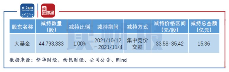 就在公司發(fā)布非公開發(fā)行股票預(yù)案后的一個(gè)月多內(nèi)(10月12日至11月4日),大基金通過集中競價(jià)交易方式減持公司股份4479.33萬股,占總股本的1%。減持價(jià)格區(qū)間在33.58元/股-35.42元/股,套現(xiàn)近15.36億元。大基金此次計(jì)劃減持近8959萬股,截至11月4日,大基金減持計(jì)劃實(shí)施過半,未來仍有可能會減持。