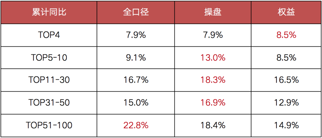 一方面,TOP50房企更注重自身規模的高質量發展,2020年TOP50各梯隊的操盤業績增速較全口徑都較高。而對于TOP51-100梯隊房企,業績規模仍處于企業戰略發展的重要位置。年內中小規模房企更多地通過項目合作謀求全口徑業績的增長空間,全口徑業績增速達22.8%,顯著高于操盤和權益口徑。