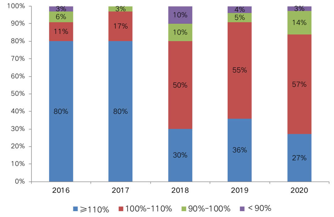從2020年房企的目標完成情況來看,絕大部分在年內設定了業績目標的規模房企,均完成了年度業績目標。其中,自二季度以來,有部分規模房企積極抓住銷售窗口期、加速去化,在11月就提前完成全年目標。