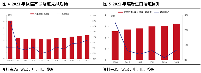 2021年原煤產(chǎn)量保持小幅增長(zhǎng),但全年供應(yīng)整體偏緊。2021年,全國(guó)原煤產(chǎn)量40.71億噸,同比增長(zhǎng)4.7%。具體來(lái)看,2021年3月份冬季保供結(jié)束以后,晉陜蒙主產(chǎn)地安全環(huán)保檢查頻繁,包括山西省的煤礦安全大排查,陜西榆林煤礦超產(chǎn)檢查,山西晉北地區(qū)中央環(huán)保組督查等,且內(nèi)蒙古反腐、煤管票影響持續(xù)。2021年3-9月,全國(guó)原煤月產(chǎn)量基本低于去年同期,煤炭實(shí)際供給持續(xù)受限。2021年四季度,隨著增產(chǎn)保供政策的持續(xù)加碼,原煤產(chǎn)量同比增速水平明顯抬升。進(jìn)口方面,2021年煤及褐煤進(jìn)口量為3.2億噸,同比增長(zhǎng)6.6%,上半年因澳煤禁運(yùn)導(dǎo)致進(jìn)口量大幅低于去年同期,下半年受國(guó)內(nèi)供應(yīng)形勢(shì)緊張影響進(jìn)口政策有所放開(kāi),全年進(jìn)口量回歸正增長(zhǎng)。雖然煤炭進(jìn)口仍然發(fā)揮了一定的調(diào)劑作用,但預(yù)計(jì)隨著國(guó)內(nèi)保供穩(wěn)產(chǎn)的逐步落實(shí),對(duì)于進(jìn)口煤的政策放松難以延續(xù)。