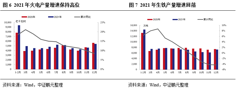 2021年我國(guó)經(jīng)濟(jì)繼續(xù)復(fù)蘇,工業(yè)企業(yè)生產(chǎn)整體用電負(fù)荷高,電廠日耗處于高位,同時(shí)下游非電耗煤需求仍有支撐,全年煤炭消費(fèi)同比增長(zhǎng)4.6%。2021年火力發(fā)電量增速較快,鋼鐵等非電耗煤需求減弱。電力方面,2021年火電發(fā)電量5.77萬(wàn)億千瓦時(shí),同比增長(zhǎng)8.4%,一方面2021年以來(lái)我國(guó)社會(huì)用電量保持較高增速,全社會(huì)總用電量為8.32萬(wàn)億千瓦時(shí),同比增長(zhǎng)10.3%。另一方面,受氣候影響,水電發(fā)電量全年同比下降2.50%。鋼鐵方面,2021年我國(guó)生鐵產(chǎn)量為8.69億噸,同比下降4.3%,6月以來(lái)產(chǎn)量低于去年同期。建材方面,2021年全國(guó)水泥產(chǎn)量23.63億噸,同比下降1.2%,年內(nèi)增速由正轉(zhuǎn)負(fù)。