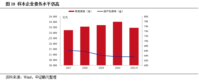 樣本企業(yè)資產(chǎn)負(fù)債率未有顯著改善,整體仍處于較高水平。截至2021年9月末,樣本企業(yè)平均資產(chǎn)負(fù)債率為62.71%,較年初下降0.57個(gè)百分點(diǎn)。各樣本企業(yè)之間資產(chǎn)負(fù)債率分化明顯,資產(chǎn)負(fù)債率最高值為87.68%,最低值為25.60%。高杠桿企業(yè)占比仍較高,資產(chǎn)負(fù)債率低于50%的企業(yè)共7家,占比19.44%;資產(chǎn)負(fù)債率在50%-70%的企業(yè)共16家,占比44.44%;資產(chǎn)負(fù)債率高于70%的企業(yè)共13家,占比36.11%。雖然受益于行業(yè)高景氣度,煤企整體盈利狀況較好,但資產(chǎn)負(fù)債率未有顯著改善,整體仍處于較高水平。中證鵬元預(yù)計(jì)中期煤炭?jī)r(jià)格運(yùn)行中樞有望較“十三五”期間抬升,需關(guān)注在雙碳目標(biāo)深化前的窗口期下,煤企財(cái)務(wù)杠桿水平能否出現(xiàn)壓降。