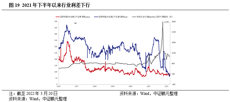 2021年下半年以來(lái)煤企信用利差在高景氣度下迅速下行至數(shù)年來(lái)低位,弱資質(zhì)煤企信用利差受政策影響波動(dòng)較大