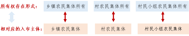 根據相關法律法規所確立的原則,允許其首次入市的法定主體為集體經營性建設用地的所有權人。而再次入市的,允許的入市主體即為已經取得集體經營性建設用地使用權的使用權人。回溯集體經營性建設用地的所有權與入市主體的匹配形式, 主要存在三種情形,分別如下對應所示:
