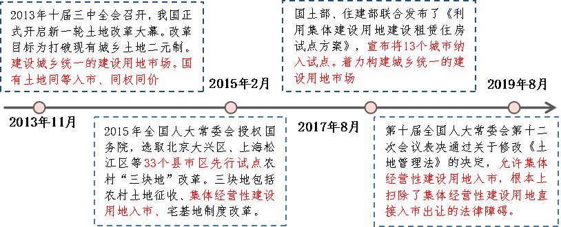 2019 年 8 月第十三屆全國人大常委會第十二次會議表決通過關于修改《土地管理法》的規定,允許集體經營性建設用地入市,從根本上掃除了集體經營性建設用地直接入市出讓的法律障礙。其法律政策修改流程如下所示: