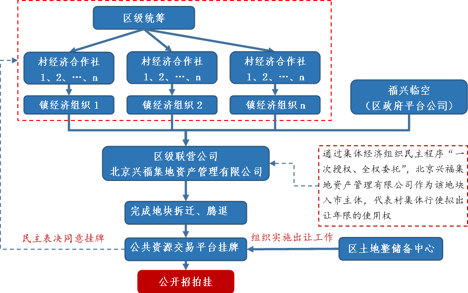 在上述模式中,大興區采取集中統籌方式,成立區級有限公司獨立完成地塊拆遷、騰退等一級整理工作,最終待地塊收儲后到二級市場獨立摘地。