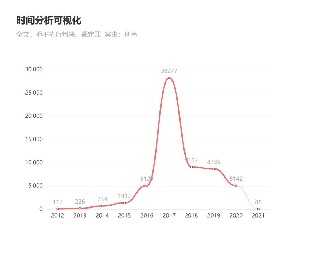 根據第三方數據平臺的裁判文書數據顯示,拒執罪在2016年前基本沒有太多應用。2016年到2020年期間,呈上升態勢,但也均未超過1萬(注:2017年數據28277件中,河南省貢獻25381件,屬于當年的個別偏差現象)。