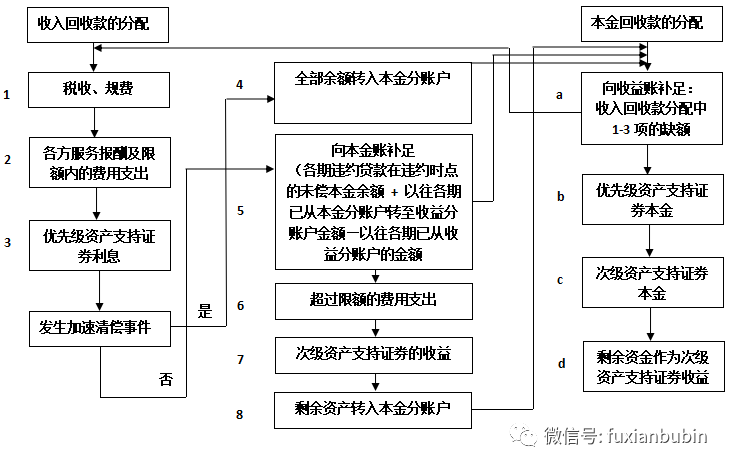 流動性問題是指現金流短期流動性不足。發生的原因在于當期資產池現金流因資產池中產生的任何損失以外的事由而引發短缺,因而無法足額向資產支持證券的投資者兌付當期本金和利息的問題。目前的不良資產證券化項目中,一般僅為當期應付的稅費、高級費用以及優先級資產支持證券利息提供流動性支持。具體分配如下圖: