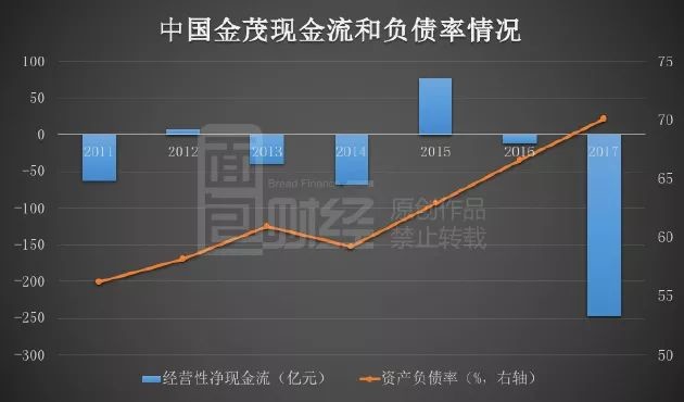 與近年來中國房地產企業(yè)整體情況一樣,中國金茂的負債率在逐年攀升,從2014年的59.19%提升至2017年末的70.08%。目前,中國金茂70.08%的資產負債率,處于行業(yè)中等水平。由于中國金茂的投資物業(yè)是按公允價值入賬,因此其資產負債率的真實水平可能會要高一點。
