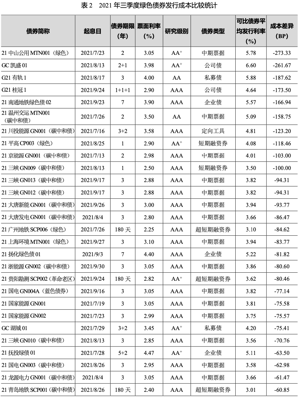 [1]成本差異指綠色債券票面利率與可比債券平均發(fā)行利率的差值,具有成本優(yōu)勢指成本差異小于0。可比債券為綠色債券起息日前后各十五天內(nèi)起息的同期限、同級別、同券種的非綠色債券,不包括中央?yún)R金公司、中國鐵路總公司發(fā)行的債券;對含有選擇權(quán)的債券按選擇權(quán)之前的期限統(tǒng)計;短期融資券和超短期融資券選用其主體級別,其他券種均選用債項級別。