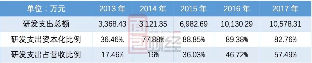財報顯示,海虹控股從2013年開始出現研發支出。2013-2017年公司的研發支出金額、占營收比例及資本化比例如下:
