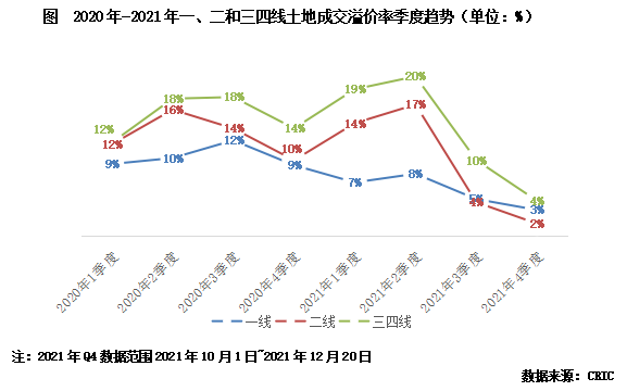 四季度也基本延續(xù)了三季度的下降之勢,整體溢價率降至3%。分能級來看,各能級溢價率均已經(jīng)跌破5%。其中,一線城市溢價率降至3%,二線城市中杭州、武漢、長沙等首輪土拍熱度較高的城市在第二輪土拍中均遭遇了大面積寒潮,導致平均溢價率進一步走低,溢價率降至2%,三四線城市亦難逃脫降溫趨勢,2021年第四季度溢價率僅有4%,降至歷史新低。