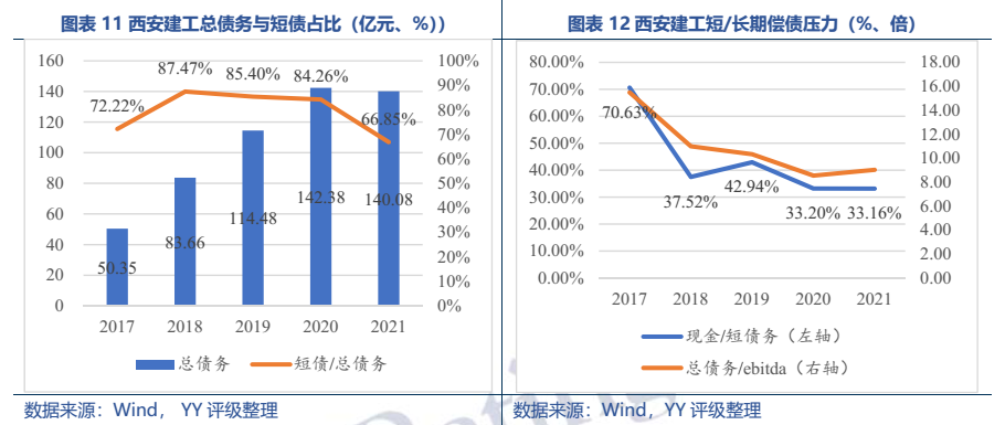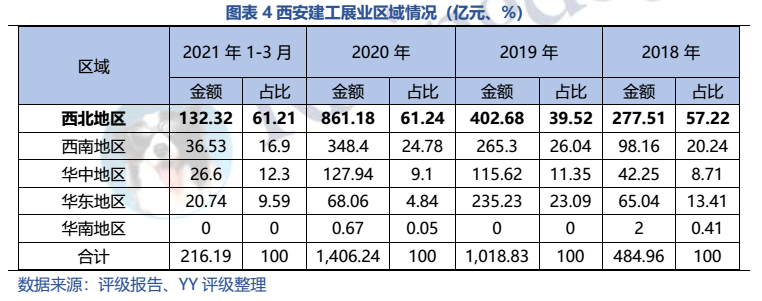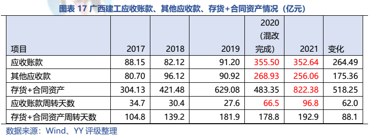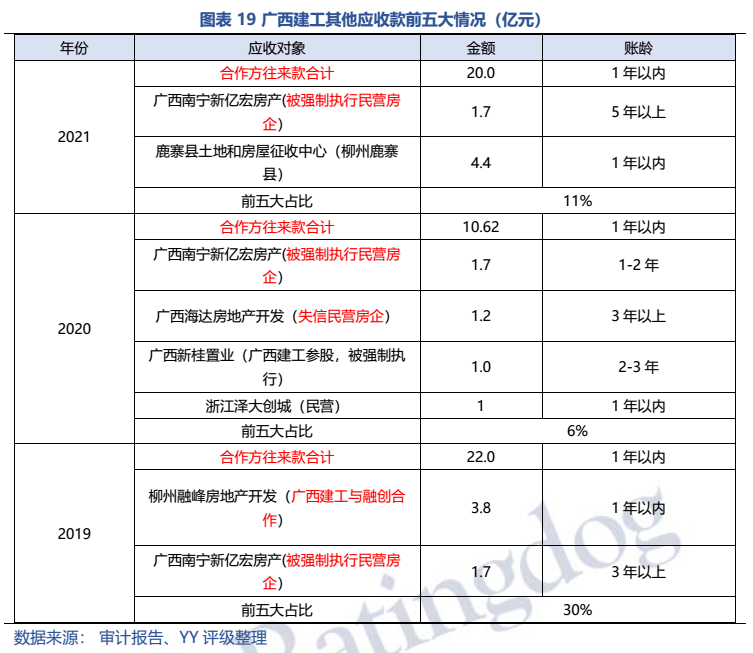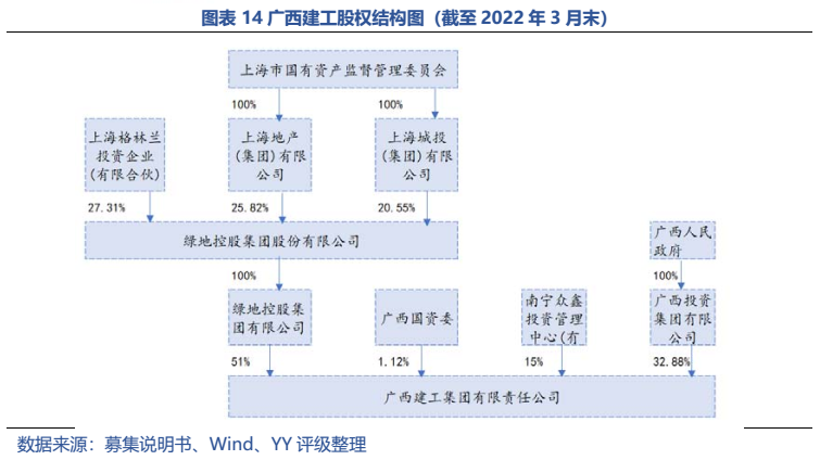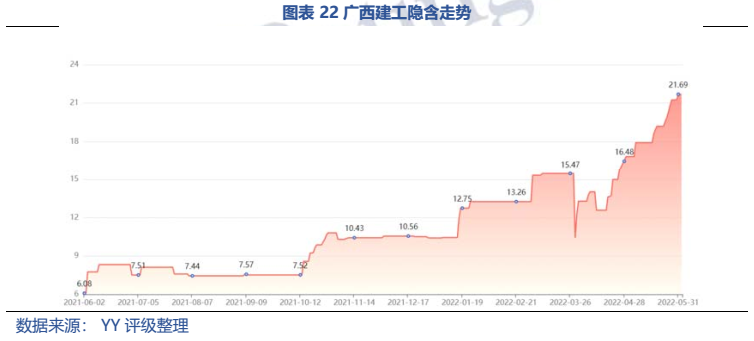 梳理分析下來,可知西安建工混改完成后新簽合同大幅增加,同時,房建占比提升,展業(yè)區(qū)域由西安市內拓展至西北區(qū)域;對綠地風險敞口51億元,其他對手方以民營房企和弱國企為主,資質較弱;綠地展期后,暫無前臺成交,預計后續(xù)隱含將明顯弱化。廣西建工混改完成后業(yè)務變化不大,仍以房建為主,集中在廣西展業(yè);與綠地資金牽連不大(或未披露),但業(yè)務對手方資質弱,以出險房企、失信民營房企和弱城投為主;在年內到期或行權債券約60億元的情況下,綠地展期后隱含急劇弱化,YY隱含飆升至20以上。