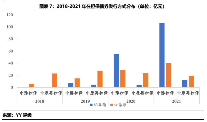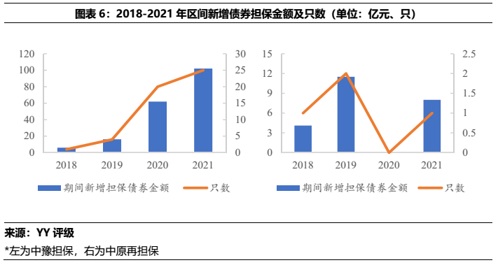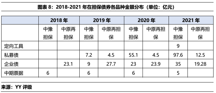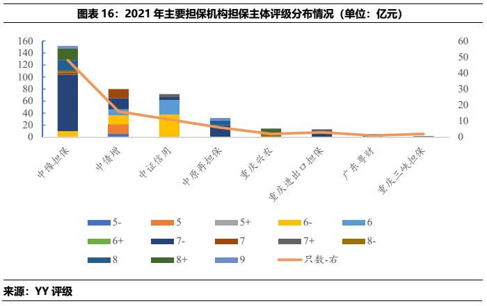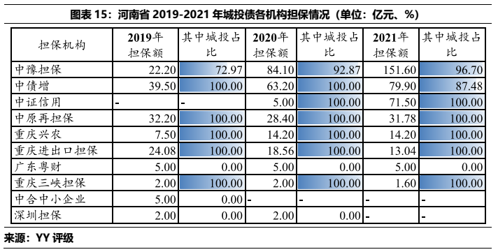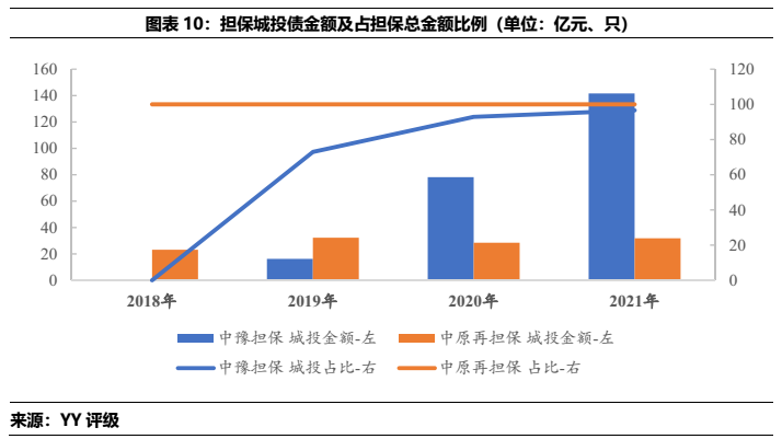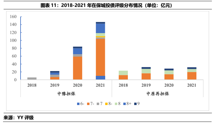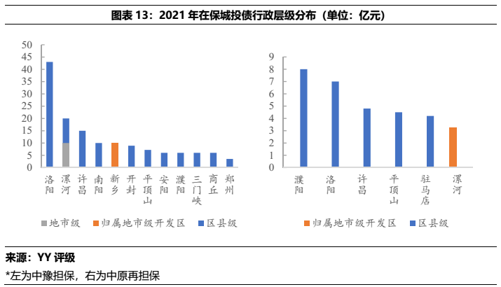 從中豫擔保和中原再擔保的展業情況看,二者僅在省內展業,中豫擔保在主要的直保業務上規模遠大于中原再擔保,同時二者債券擔保中城投占比很高,2021年的在保城投債分別占總擔保債券的97%(中豫增)和100%(中原再擔保)。所擔保城投債YY評級集中在7檔和8檔,所處行政區域中以區縣級為主,各城市中洛陽市的擔保體量較為突出,其次是許昌、漯河和新鄉。