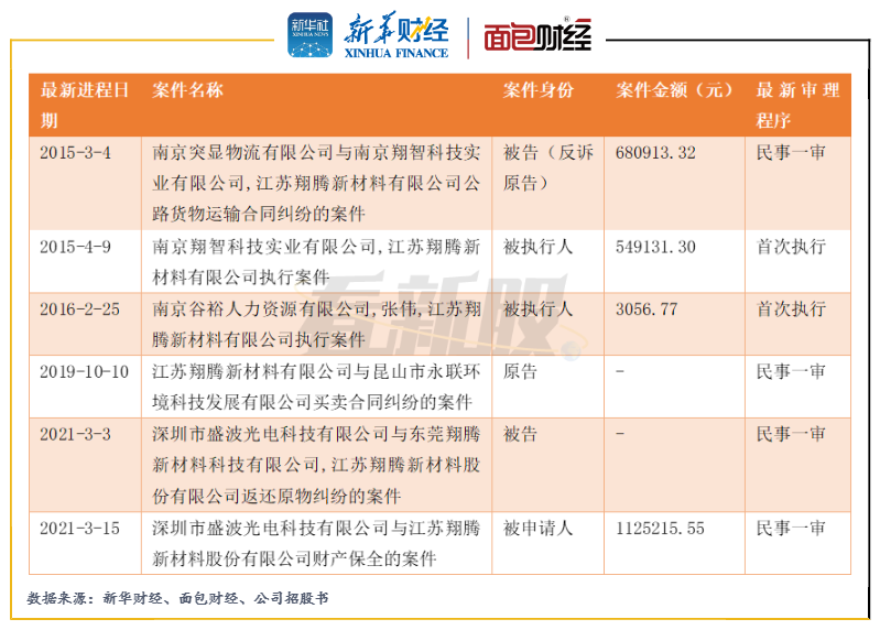 根據企查查數據,2021年,翔騰新材作為被申請人涉及與深圳市盛波光電科技有限公司的財產保全案件,涉案金額為112.52萬元,最新的審理進度為民事一審。未來公司如需承擔賠償責任,對其利潤或產生一定影響。