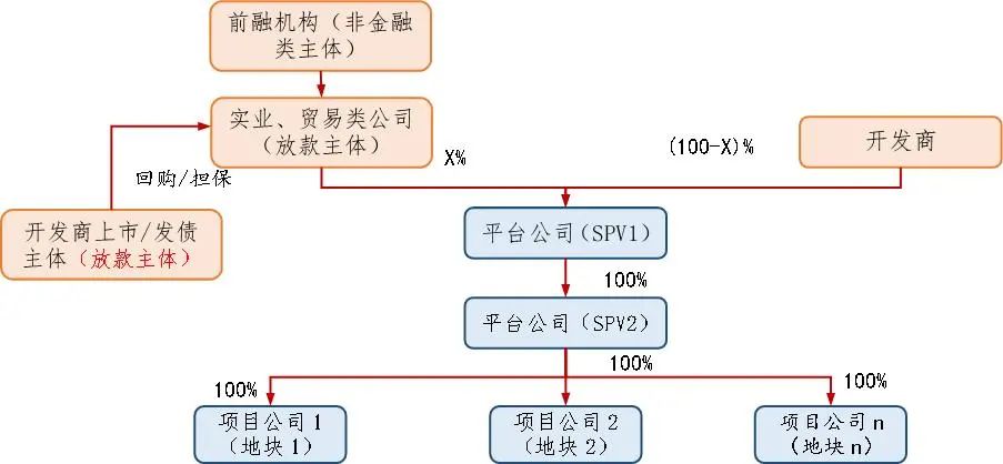 其中:平臺(tái)公司SPV1注冊(cè)資本設(shè)置為較小金額(如300萬(wàn)元)。放款主體需轉(zhuǎn)入的剩余融資款以股東借款的形式注入平臺(tái)公司SPV1。另外開發(fā)商持有的平臺(tái)公司SPV1的股權(quán)質(zhì)押給放款主體,同時(shí)由開發(fā)商的上市或發(fā)債主體提供擔(dān)保。