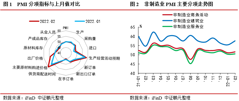 一,PMI小幅上行,新訂單指數(shù)重回?cái)U(kuò)張區(qū)間,需求強(qiáng),生產(chǎn)弱,預(yù)期強(qiáng)。2月PMI指數(shù)為50.2%,小幅上升0.1個(gè)百分點(diǎn),非制造業(yè)商務(wù)活動(dòng)指數(shù)為51.6%。受季節(jié)性和春節(jié)因素影響,生產(chǎn)指數(shù)為50.4%,比上月下降0.5個(gè)百分點(diǎn),生產(chǎn)雖小幅放緩但仍高于臨界點(diǎn);生產(chǎn)經(jīng)營(yíng)活動(dòng)預(yù)期為58.7%,較上月大幅增加1.2個(gè)百分點(diǎn),穩(wěn)增長(zhǎng)預(yù)期強(qiáng)。新訂單指數(shù)為50.7%,比上月上升1.4個(gè)百分點(diǎn),需求端時(shí)隔6個(gè)月重回?cái)U(kuò)張區(qū)間。主要原材料購(gòu)進(jìn)價(jià)格和出廠價(jià)格大幅上漲。