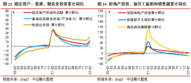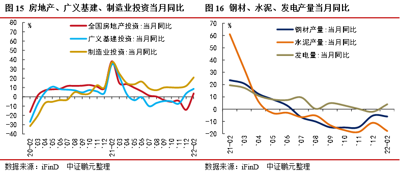 五,制造業(yè)投資保持兩位數(shù)增長(zhǎng),基建投資有所好轉(zhuǎn),房地產(chǎn)投資雖有上升但銷售和開(kāi)工仍低迷。1-2月份,制造業(yè)投資增速為20.9%,主要受基數(shù)影響。狹義基建投資增速8.1%,比2021年全年加快7.7個(gè)百分點(diǎn),比2021年12月高8.7個(gè)百分點(diǎn)。廣義基建投資增速為8.6%,比2021年12月高4.8個(gè)百分點(diǎn),基建投資增速回暖,因穩(wěn)增長(zhǎng)背景下,政策發(fā)力靠前。房地產(chǎn)投資當(dāng)月同比大幅回暖,商品房銷售和房屋新開(kāi)工不景氣,鋼材、水泥產(chǎn)量負(fù)增長(zhǎng)進(jìn)行了驗(yàn)證。