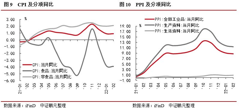 三,CPI同比持平走低,環(huán)比漲幅略有擴(kuò)大;PPI同比繼續(xù)回落,環(huán)比由跌轉(zhuǎn)升,警惕輸入性通脹風(fēng)險(xiǎn)。CPI同比上漲0.9%,與上月持平,核心CPI同比上漲1.1%,漲幅比上月回落0.1個(gè)百分點(diǎn),CPI環(huán)比上漲0.6%,漲幅比上月擴(kuò)大0.2個(gè)百分點(diǎn)。PPI同比上漲8.8%,環(huán)比上漲0.5%。近期俄烏沖突地緣政治影響下原油等大宗商品大幅上漲,疫情造成的產(chǎn)業(yè)鏈未完全恢復(fù),警惕輸入性通脹風(fēng)險(xiǎn),今年CPI預(yù)計(jì)溫和上漲,PPI預(yù)計(jì)逐漸回落。
