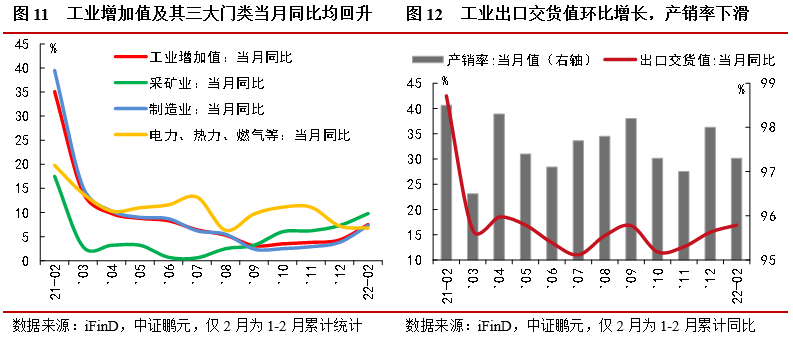 1-2月份,規(guī)模以上工業(yè)增加值同比增長(zhǎng)7.5%,較2021年12月份加快3.2個(gè)百分點(diǎn),較2021年兩年平均增速加快1.4個(gè)百分點(diǎn)。從環(huán)比看,2月份,規(guī)模以上工業(yè)增加值比上月增長(zhǎng)0.34%。工業(yè)生產(chǎn)延續(xù)去年四季度以來(lái)逐月回升態(tài)勢(shì),多數(shù)行業(yè)生產(chǎn)增速有所加快,工業(yè)出口繼續(xù)兩位數(shù)增長(zhǎng)。