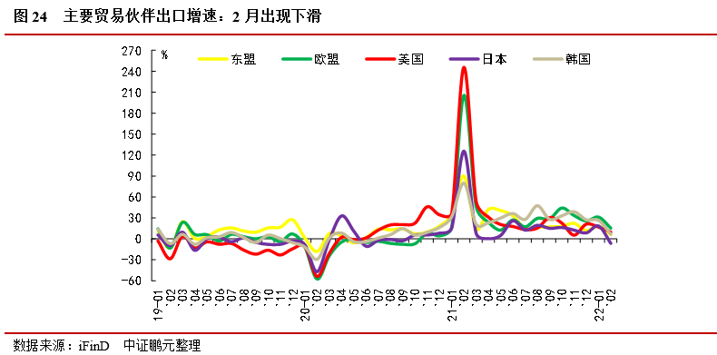 歐盟、東盟、美國(guó)為前三大主要貿(mào)易伙伴,對(duì)主要貿(mào)易國(guó)增速出現(xiàn)下滑。前2個(gè)月,與歐盟貿(mào)易總值為8,746.4億元,增長(zhǎng)12.4%,占我外貿(mào)總值的14.1%。其中,對(duì)歐盟出口增長(zhǎng)21.4%,對(duì)歐盟進(jìn)口下降2%。與東盟貿(mào)易總值為8,704.7億元,增長(zhǎng)10.5%,占14%。其中,對(duì)東盟出口增長(zhǎng)10.6%,自東盟進(jìn)口增長(zhǎng)10.3%。中美貿(mào)易總值為7,859.2億元,增長(zhǎng)9.7%,占12.7%。其中,對(duì)美國(guó)出口增長(zhǎng)11.1%,自美國(guó)進(jìn)口增長(zhǎng)5.8%;從單月出口增速來(lái)看,2月對(duì)歐盟、東盟、美國(guó)、日本、韓國(guó)出口增速為15.4%、5.9%、9.7%、-6.4%、6.7%,1月數(shù)值為31.2%、18.2%、16.9%、18.5%、26.5%,2021年12月數(shù)值為25.6%、12.0%、21.2%、8.6%、27.4%,對(duì)主要貿(mào)易國(guó)增速出現(xiàn)下滑。