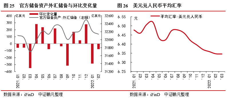 九,2月外匯儲(chǔ)備規(guī)模為32, 138億美元,環(huán)比降幅為0.24%,美元兌人民幣匯率整體穩(wěn)定。受地緣政治局勢(shì)、主要國(guó)家貨幣政策預(yù)期轉(zhuǎn)向加快等因素影響,外匯儲(chǔ)備規(guī)模下降。從目前來(lái)看,人民幣匯率整體還在合理運(yùn)行區(qū)間。