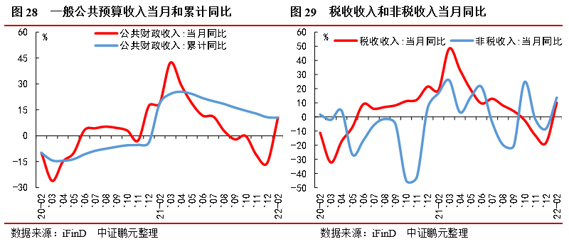 全國(guó)公共財(cái)政收入明顯加快,稅收和非稅收入均回升。1-2月累計(jì),全國(guó)一般公共預(yù)算收入46,203億元,累計(jì)同比增長(zhǎng)10.5%,前2月累計(jì)財(cái)政收入占全年預(yù)算收入比重達(dá)到22.0%,處同期高位;從當(dāng)月同比來(lái)看,扭轉(zhuǎn)負(fù)增長(zhǎng)態(tài)勢(shì),大幅高于去年12月當(dāng)月同比增速-15.8%,開(kāi)局表現(xiàn)良好。拆分來(lái)看,稅收收入、非稅收入同比增長(zhǎng)10.1%、13.7%,去年12月同比為-18.3%、-8.3%,增速由負(fù)轉(zhuǎn)正大幅提高,非稅收入增速略高于稅收收入增速,主因今年非稅收入的特定國(guó)有金融機(jī)構(gòu)上繳利潤(rùn)(前2年暫停繳納),今年非稅收入有較大的增長(zhǎng)空間。資源稅、個(gè)人所得稅大幅增長(zhǎng),同比增速為92.2%、46.8%,土地增值稅同比下降1.4%。
