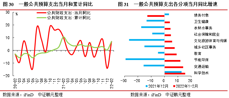 全國(guó)公共財(cái)政支出回升,靠前發(fā)力,基建支出加快。1-2月累計(jì),全國(guó)一般公共預(yù)算支出38,227億元,同比增長(zhǎng)7.0%,較2021年全年同比0.3%明顯上升,大幅高于2021年12月當(dāng)月同比-14.2%。前2月的財(cái)政支出占全年預(yù)算支出的比重達(dá)到14.3%,創(chuàng)同期新高,體現(xiàn)了積極的財(cái)政政策,發(fā)力靠前。分結(jié)構(gòu)來(lái)看,10個(gè)支出分項(xiàng)中累計(jì)同比增速由高至低:科學(xué)技術(shù)(15.5%)、交通運(yùn)輸(14.0%)、節(jié)能環(huán)保(11.9%)、教育(9.1%)、城鄉(xiāng)社區(qū)事務(wù)(7.6%)、文化旅游體育與傳媒(5.7%)、社會(huì)保障和就業(yè)(7.8%)、農(nóng)林水事務(wù)(3.5%)、衛(wèi)生健康(4.0%)、債務(wù)付息(-12.9%)。基建支出(交通運(yùn)輸、城鄉(xiāng)社區(qū)事務(wù)、農(nóng)林水事務(wù))表現(xiàn)較快增長(zhǎng),1-2月增長(zhǎng)8.0%,大幅高于去年12月單月同比-16.4%、也高于去年12月兩年平均增速-4.8%。民生性支出(衛(wèi)生健康、社會(huì)保障和就業(yè)、教育)也表現(xiàn)較好,科學(xué)技術(shù)支出增速最快。