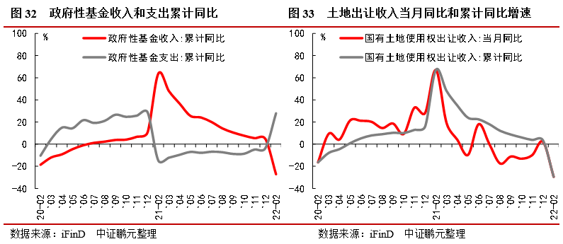 政府性基金收入負(fù)增長(zhǎng),主要受土地出讓金拖累。1-2月累計(jì),全國(guó)政府性基金預(yù)算收入9,159億元,同比下降27.2%,由正轉(zhuǎn)負(fù)大幅減少,去年全年增速為4.8%。其中,國(guó)有土地使用權(quán)出讓收入7,922億元,同比下降29.5%,低于去年全年同比3.5%,也低于去年12月當(dāng)月同比2.2%,在商品房銷售、竣工同比繼續(xù)回落情況下,地產(chǎn)表現(xiàn)低迷,土地出讓金銳減也是預(yù)料之中,是政府性基金預(yù)算收入主要拖累因素。