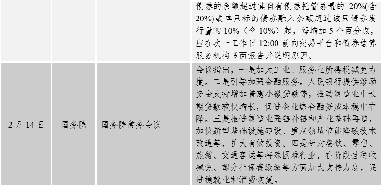 債券市場(chǎng)制度建設(shè)方面:2月8日,人民銀行、市場(chǎng)監(jiān)管總局等部門(mén)聯(lián)合印發(fā)《金融標(biāo)準(zhǔn)化“十四五”發(fā)展規(guī)劃》,明確七個(gè)方面的重點(diǎn),提出到2025年,與現(xiàn)代金融體系相適應(yīng)的標(biāo)準(zhǔn)體系基本建成,金融標(biāo)準(zhǔn)化的經(jīng)濟(jì)效益、社會(huì)效益、質(zhì)量效益和生態(tài)效益充分顯現(xiàn),標(biāo)準(zhǔn)化支撐金融業(yè)高質(zhì)量發(fā)展的地位和作用更加凸顯。展望2035年,科學(xué)適用、結(jié)構(gòu)合理、開(kāi)放兼容、國(guó)際接軌的金融標(biāo)準(zhǔn)體系更加健全,市場(chǎng)驅(qū)動(dòng)、政府引導(dǎo)、企業(yè)為主、社會(huì)參與、開(kāi)放融合的金融標(biāo)準(zhǔn)化工作格局全面形成,標(biāo)準(zhǔn)化成為支撐金融業(yè)高質(zhì)量發(fā)展的重要力量。2月8日,人民銀行、銀保監(jiān)會(huì)明確保障性租賃住房項(xiàng)目有關(guān)貸款不納入房地產(chǎn)貸款集中度管理,加大對(duì)保障性租賃住房發(fā)展的支持力度。2月11日,人民銀行發(fā)布《銀行間債券市場(chǎng)債券借貸業(yè)務(wù)管理辦法》,對(duì)債券借貸對(duì)象、要求、期限等進(jìn)行了規(guī)定,增加了集中債券借貸業(yè)務(wù)。