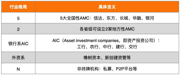 表1:不良資產(chǎn)處置行業(yè)“5+2+銀行系A(chǔ)IC+外資系+N”格局