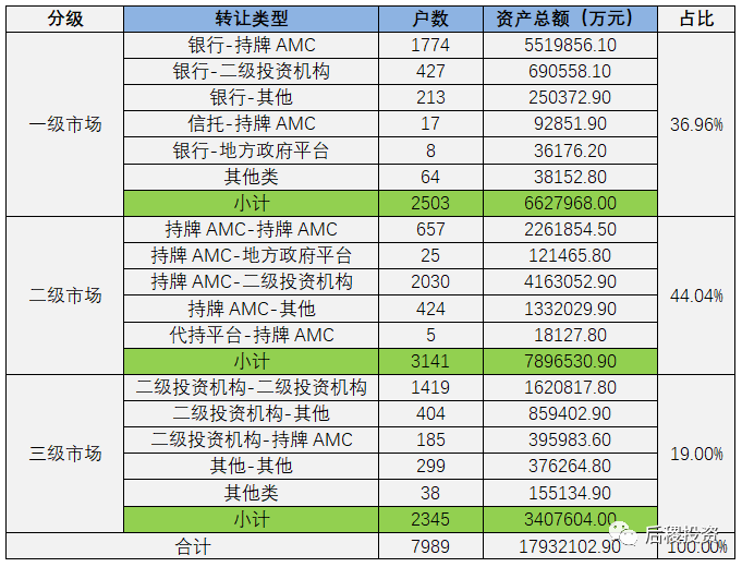 一般的,我們將銀行端出包為一級市場,持牌AMC出包為二級市場,除此為三級市場。