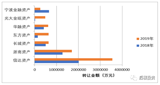 從整體上看,18年持牌AMC受讓銀行資產體量最小;從個體上看,信達資產、華融資產逐年減少 ;浙商資產、東方資產、光大金甌資產逐年增加,尤其光大金甌資產和東方資產19年增加最顯著。
