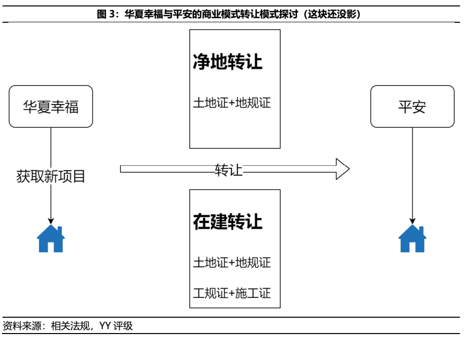 因此,就目前華夏幸福與平安的商業模式獲取模式,仍是以華夏幸福前期出資拿地并完成報批報建后選擇在凈地和在建時進行轉讓。